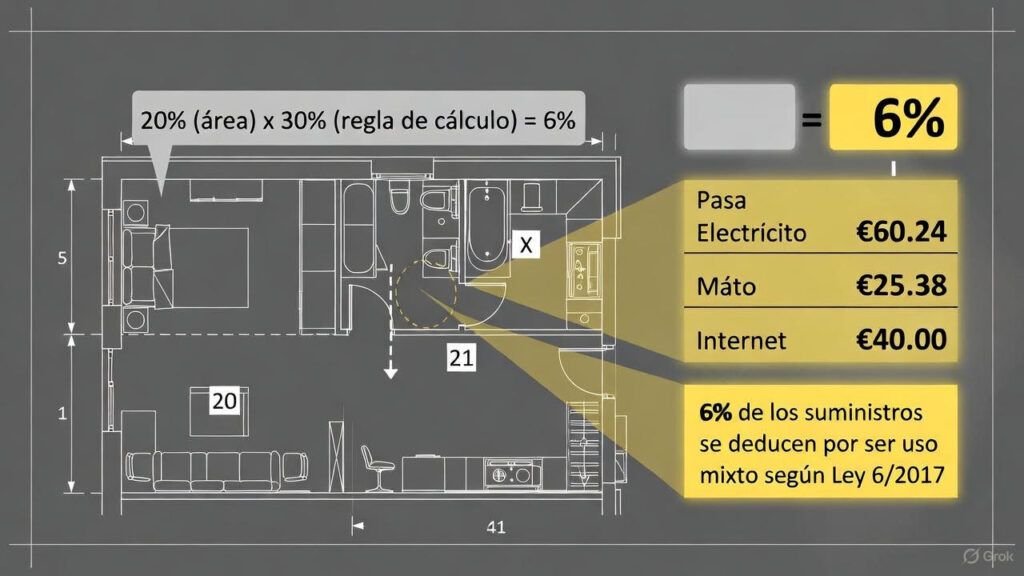 «La regla es clara y matemática: no se deduce un porcentaje directo de los suministros, sino el 30% de la proporción de metros cuadrados afectos a la actividad. Un error de cálculo aquí es un error directo en tu declaración.»